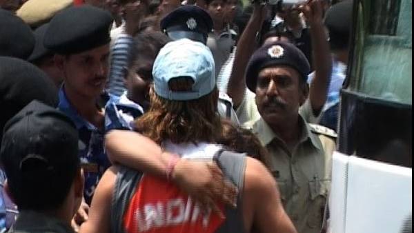 தோனியை சந்திக்க பேராவல் கொண்டிருந்த அப்பெண், ஒருமுறை பயிற்சி முடித்து தோனி அணியின் பேருந்தில் ஏறச் செல்ல முயன்ற போது, திரண்டிருந்த கூட்டத்தினரையும் மீறி, தோனியை கட்டிப்பிடித்துவிட்டார். அதிர்ச்சியடைந்த பாதுகாவலர்கள், அப்பெண்ணை கடும் போராட்டத்துக்கு பிறகு தோனியிடம் இருந்து அப்புற்ப்படுத்தினர். ஆனால், அப்பெண்ணின் நிலைமையை உணர்ந்து கொண்ட தோனி, எந்தவித கோபத்தையும், எரிச்சலையும் வெளிக்காட்டாமல், சிரித்துக் கொண்டே வேக வேகமாக பேருந்தில் சென்று ஏறிவிட்டார்.