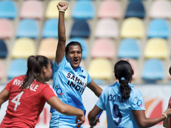 ஜூனியர் மகளிர் ஹாக்கி உலகக் கோப்பை போட்டியில் வெண்கலப் பதக்கம் வென்ற மகிழ்ச்சியில் குதிக்கும் ராணி.