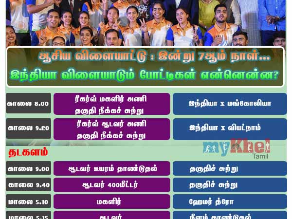 இந்நிலையில் இன்று ஏழாம் நாள் ஆசிய விளையாட்டில் இந்திய வீரர்கள் பங்கேற்கும் போட்டிகளின் அட்டவணையை கீழே காணலாம்.