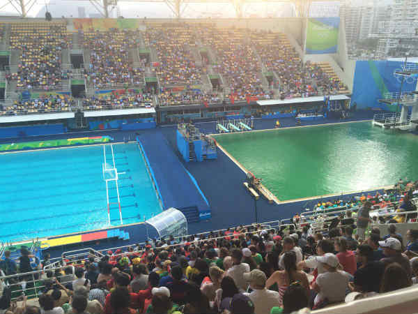 ரியோ டி ஜெனிரோ: ஒலிம்பிக் போட்டியில் நீச்சல் போட்டிக்காக நிரப்பப்பட்ட தண்ணீர் திடீரென பச்சை நிறமாக காட்சியளித்ததால் வீரர்களும், பார்வையாளர்களும் அதிர்ச்சியடைந்தனர்.