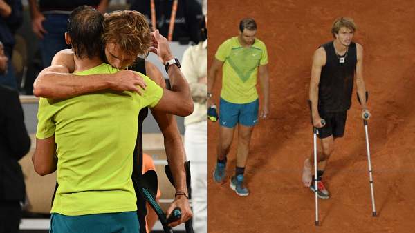 இதனால் வலியால் துடித்த அலெக்சாண்டரை மருத்துவக் குழுவினர் சோதித்து வீல் சேரில் அழைத்து சென்றனர். சிறிமு நேரத்திற்கு பிறகு வந்த ஸ்வெரேவ், காயத்தால் போட்டியிலிருந்து விலகுவதாக அறிவித்தார். இதனையடுத்து நடால் அவரை கட்டி அணைத்து வாழ்த்து தெரிவித்தார். ஸ்வெரேவ் விலகியதால், நடால் 14வது முறையாக பிரெஞ்ச் ஓபன் இறுதிப் போட்டிக்கு சென்றார்.